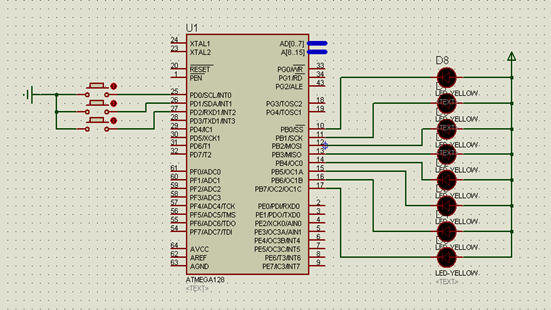 이전 예제와 마찬가지로 스위치는 GND와 연결되어 있고 LED는 Vcc와 연결되어 있다. 입력 값을 확인하기 위해서 PIND & 0x07을 해주어서 하위 3비트의 입력값을 비교하고 해당 스위치에 맞는 동작을 한다.